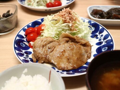 ■生姜焼き(豚ロース・おかかキャベツ・ミニトマト)■ナスの炒め煮(残り物)