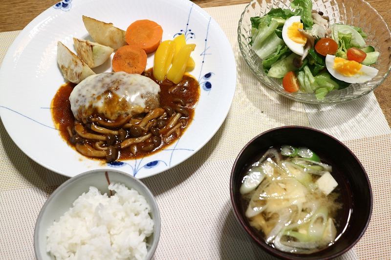 ■ハンバーグ(チーズ・シメジ入りデミソース)■サラダ■味噌汁(豆腐・葱)