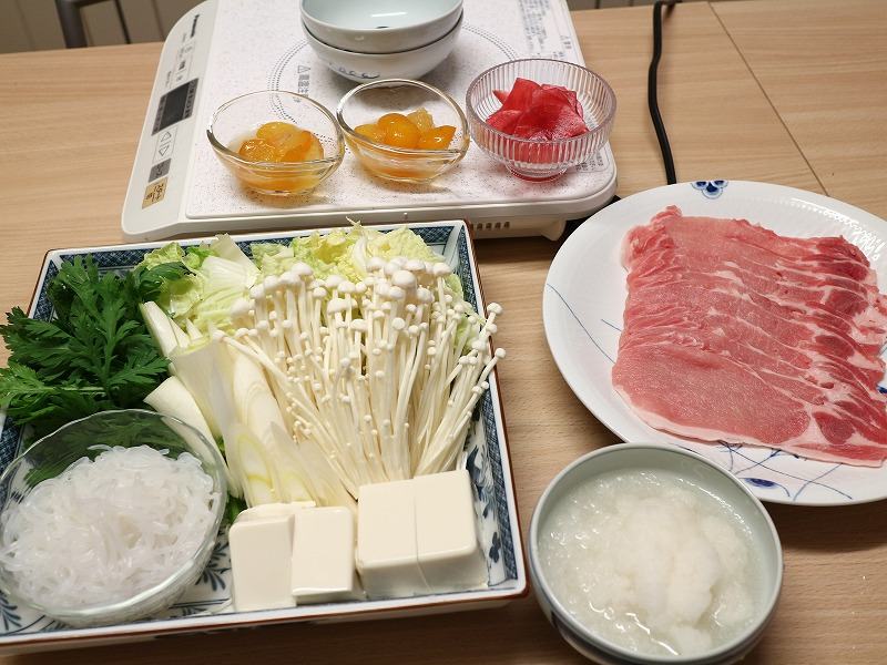 ■豚肉・白菜・春菊・えのき・葱・白滝・豆腐、大根おろし+ポン酢+柚子胡椒