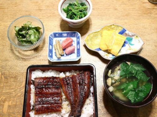 ■うな丼■だし巻き卵■ほうれん草のごま和え■きゅうりとわかめの酢の物