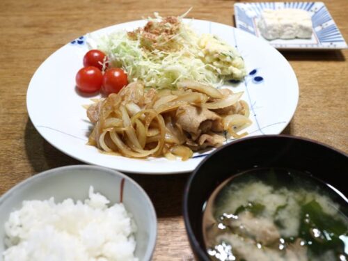 ■豚肉の生姜焼き(おかかキャベツ・ミニトマト)
