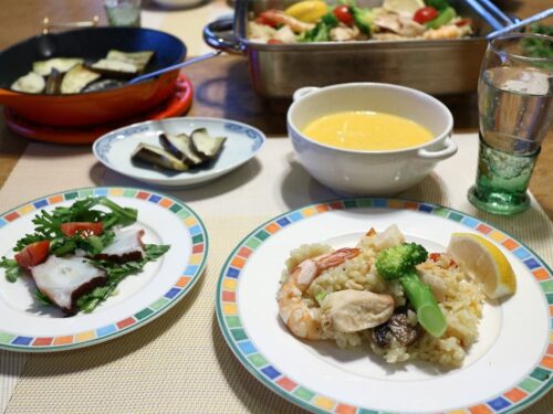 ■パエリア■タコのカルパッチョ■ナスのチーズ焼き■かぼちゃのポタージュ