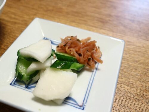 ■浅漬(きゅうり・カブ)大根のしそ漬け■味噌汁(もずく・とろろ昆布・ネギ)