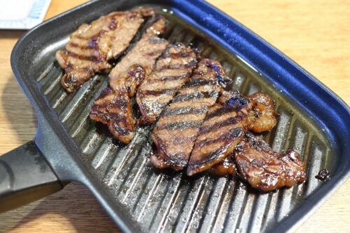 ノンスティックのグリルパンで焼くと、抜けた脂がお肉につかずにスッキリ。