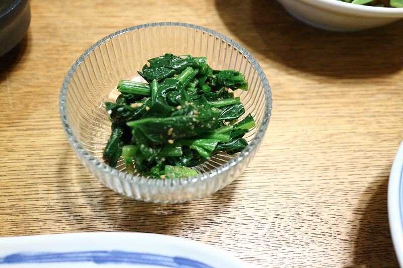 ■ほうれん草の胡麻和え■牛肉の味噌漬け■味噌汁(生なめこ・豆腐・三つ葉)
