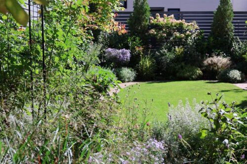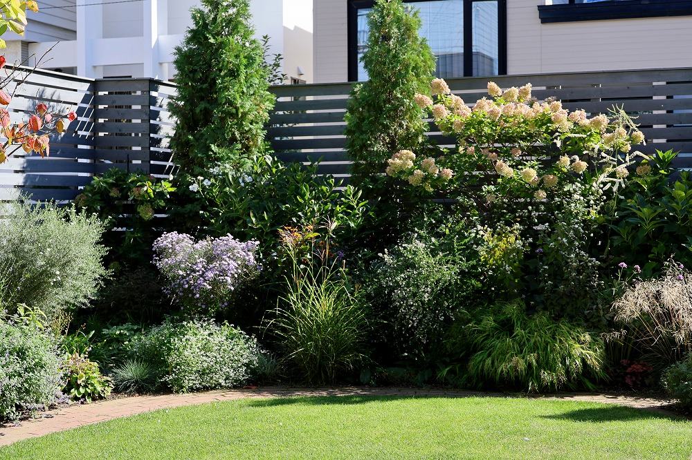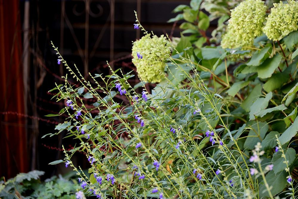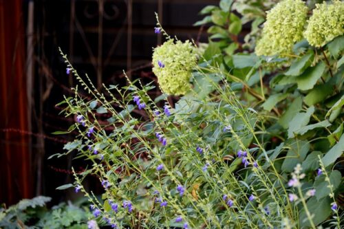 咲き始めたコバルトセージと枯れ色のアナベル
