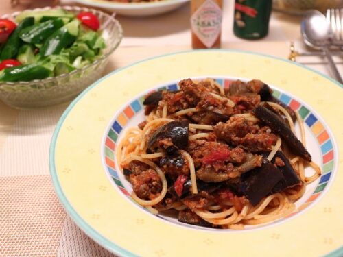 10/4-ナス入りボロネーゼ 投稿日時: 2025-10-04 投稿者: はるみん一度にたくさん作って冷凍ストックしているミートソースで サラダは、レタス・きゅうり・ミニトマト■2025/10/04(土)晴れ+14.7→+24.7