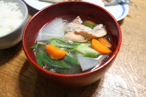隣に鮭のアラがあったので、アラ汁も(大根・人参・葱の青いとこ・昆布)
