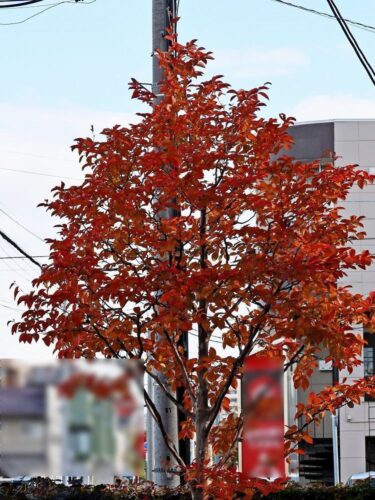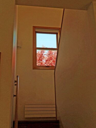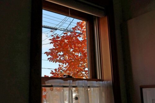 階段の踊り場の窓から見える街路樹のナナカマドの紅葉もなかなか