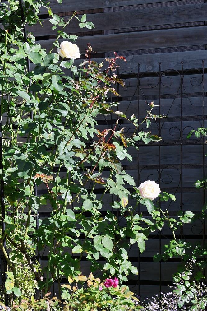 この10月に、表庭のバラアーチの間から、南庭のマダム・アルディの足元に移動して来ました。ここにあった、ピンクのユリとサルビアは小屋南に移動。