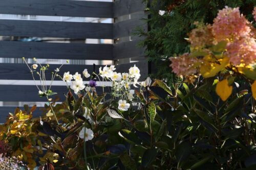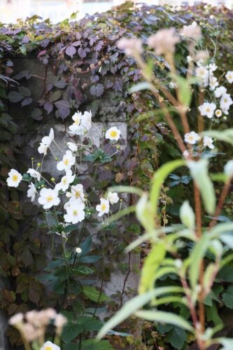 北の塀際にツタを植えるときに抜いた秋明菊を、南の角に植えておいたら、ひょろっと顔を出して咲いてます。(捨てなくてよかった)