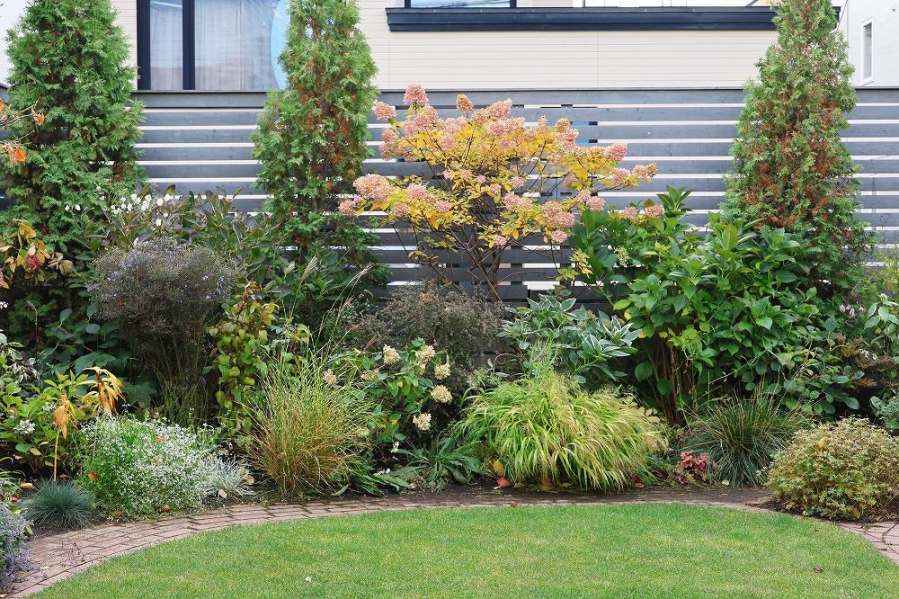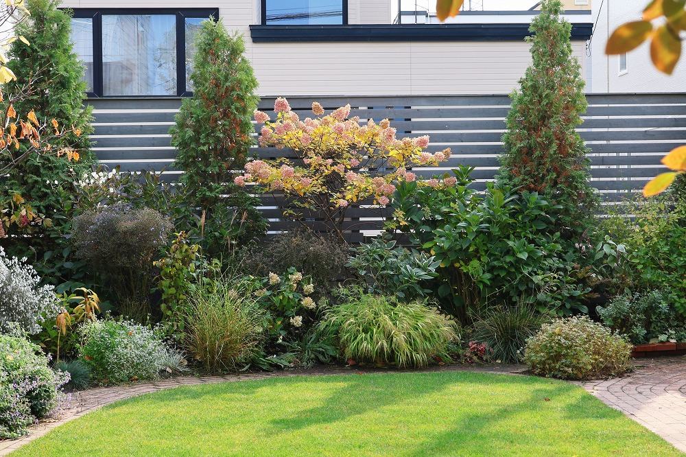 一昨年の秋にあれこれ植え替え、去年は、左のコーナー部分にあった大きくなりすぎたニオイヒバを移動したり、枯れた中央のニオイヒバを抜いたりで、またまた大物移植して、良い具合に落ち着いたはずでしたが、(↓2024年10月6日の写真)