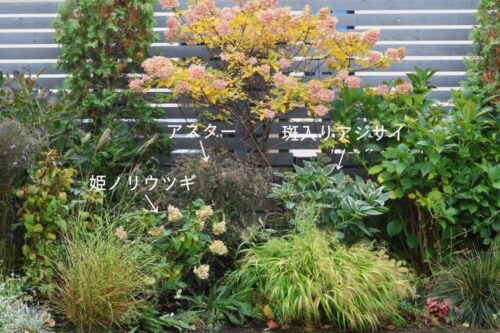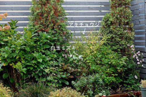 ここも秋だけのアキチョウジが出てくるまでスカスカになるので、春からずっと空間を埋めてくれる高さがあるもの考えなきゃ