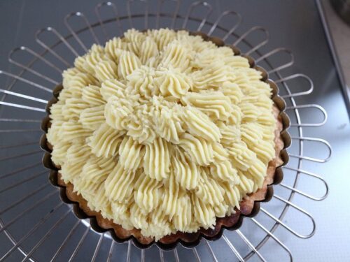 さつまいもに、柔らかくしたバターと卵を加えて混ぜ合わせましたが、固めだったので、牛乳(分量外)を少し足して絞り出せるくらいにしました。