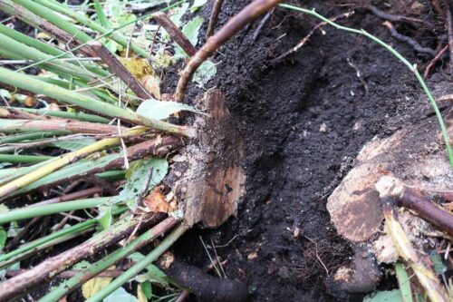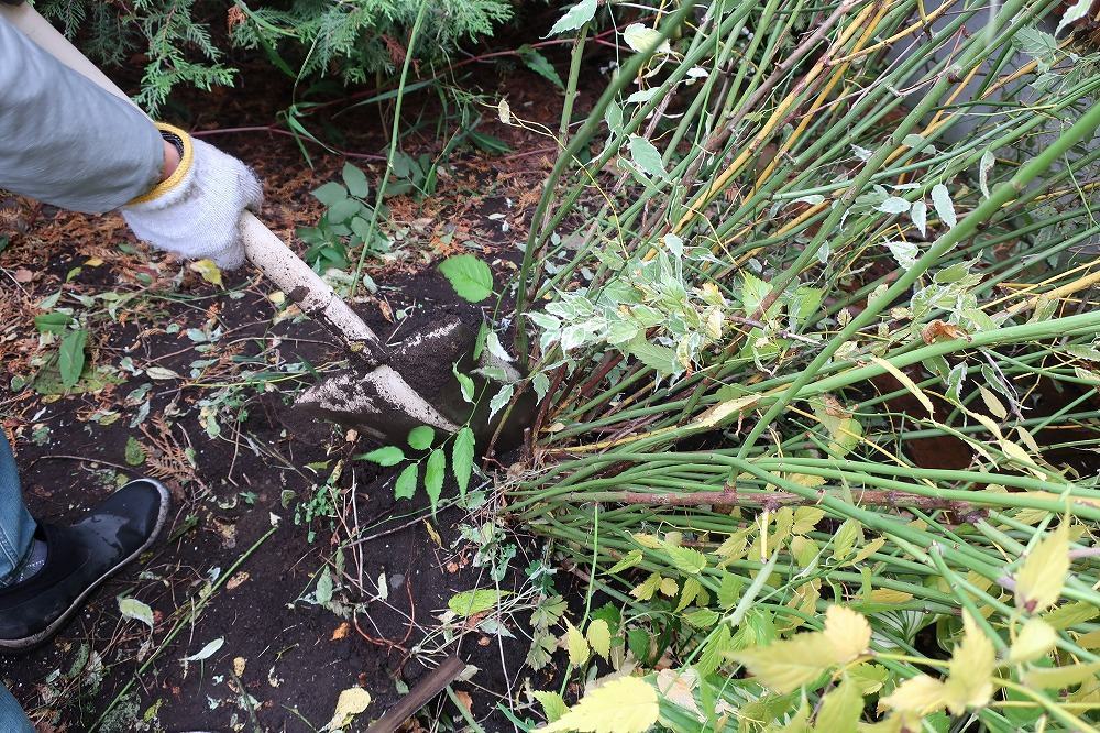 これが手強かった~~。レッドドラゴンと同じく、ひげ根で浅い根張り。ぐるりには簡単にスコップが入りましたが、茎の間にスコップが入らず。
