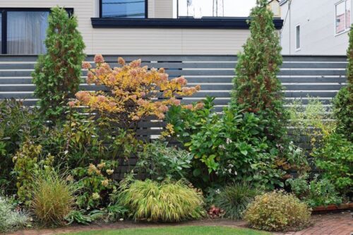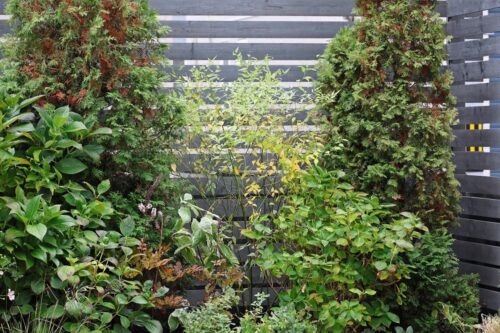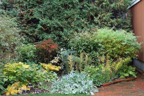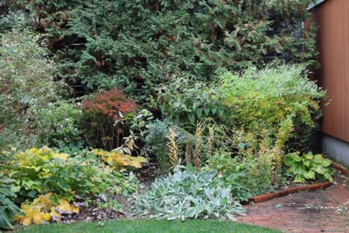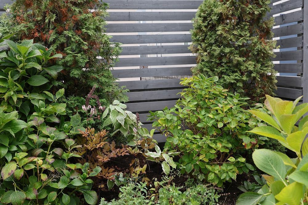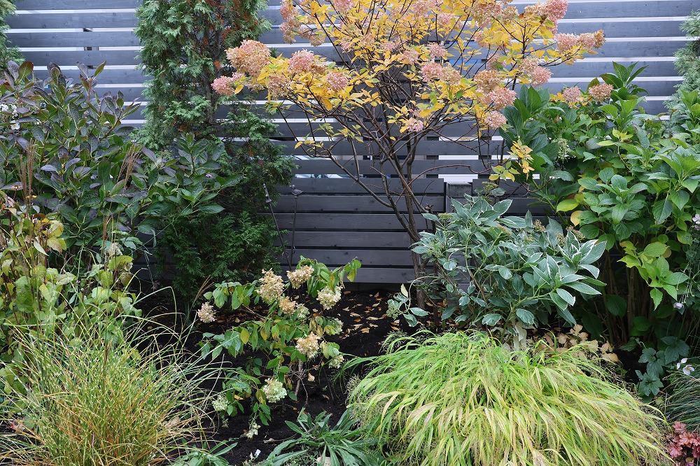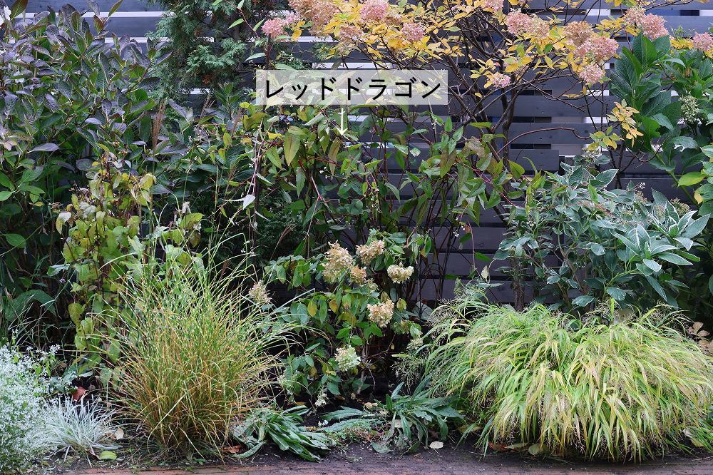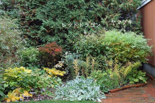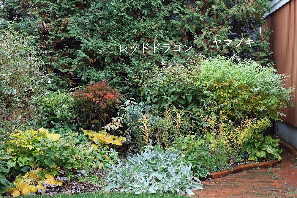これの右側も同じく、秋になると大きくなるアキチョウジにすっかり隠れてしまってたシラタマミズキを前に出してアキチョウジと入れ替え