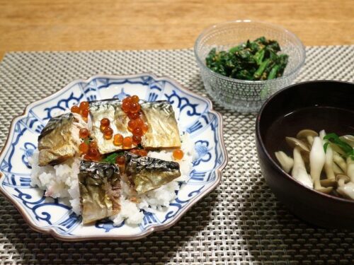 10/21-焼きサバ寿司 投稿日時: 2025-10-21 投稿者: はるみん前回は押し寿司にしましたが、ご飯の量が多くなるので、のっけスタイルで ■焼きサバ寿司(茗荷・青じそ・イクラ)■ほうれん草の胡麻和え ■清汁(シメジ・三つ葉)■2025/10/21(火)曇/晴+3.8→+10.3