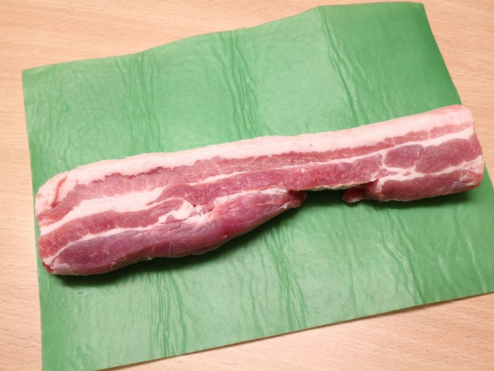 塩水につけると水ぶくれするので(カリカリベーコンになりにくい)揉み込みで