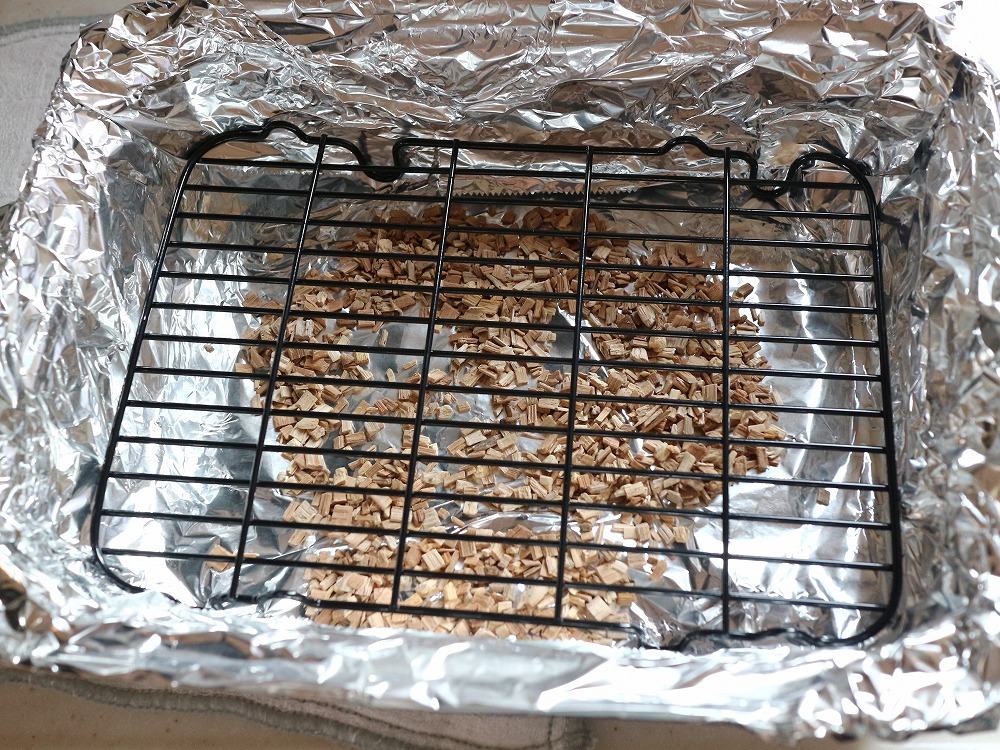 煙でお鍋が汚れるのを避けたく、内側にアルミフォイルを敷き、ヒッコリーチップを20gくらい散らして網を乗せ