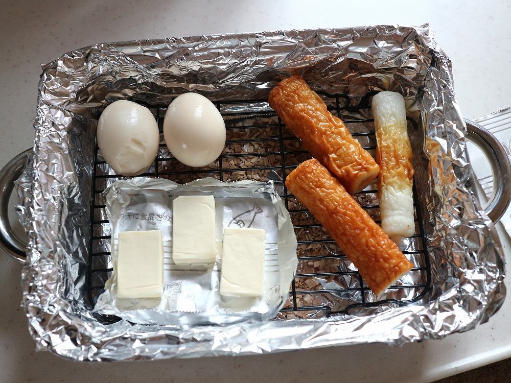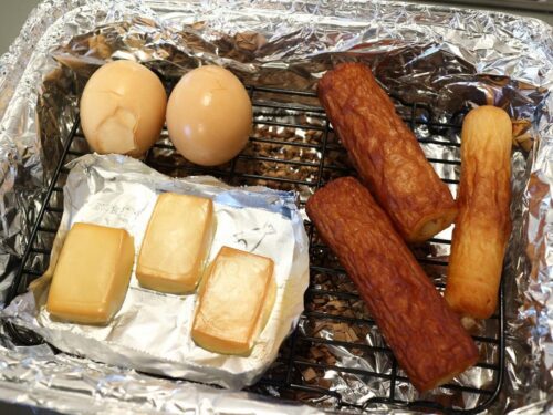 薄めた麺つゆにつけておいた茹で卵、プロセスチーズ、ちくわ