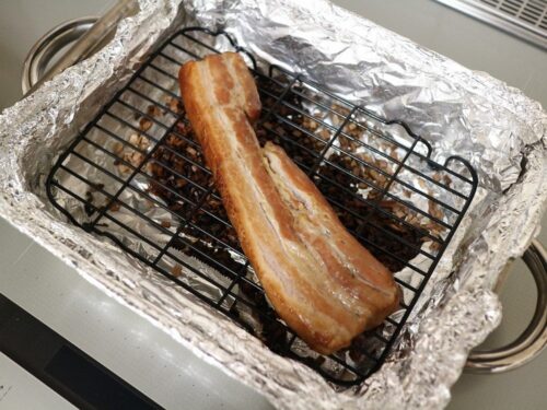 竹輪の時と同じく、お鍋の内側にアルミフォイルを敷き、ヒッコリーチップを20g散らして網を置き、お肉を乗せて蓋をしてグリルへ