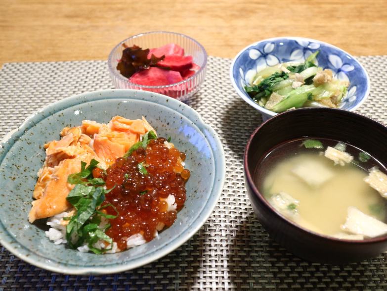 11/27-鮭の親子丼 投稿日時: 2025-11-27 投稿者: はるみん今年は生筋子が高い上に、なかなか入荷しないので、見つけた時にちょっとだけ漬けた自作のいくら醤油漬け。 小分けして冷凍しましたが、味見を兼ねて蓋開け。 ■鮭の親子丼■青梗菜と油揚げの煮浸し■赤カブ甘酢漬け■インスタント味噌汁■2025/11/27(木)晴れ+1.6→+9.3