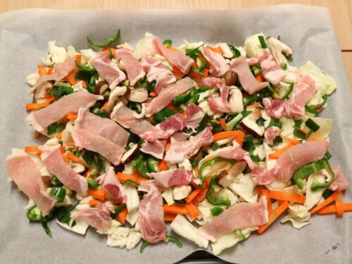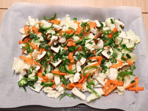 天板にオーブンシートを敷いて、刻んだ野菜を広げ