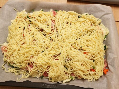 一番上に蒸し麺を広げ(使ったのは、菊水の3玉入りソース焼きそば)