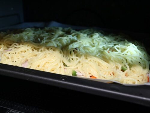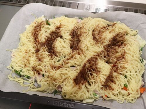 オーブンの中段に入れて、ビストロ2700の料理集→番号で選ぶ→147「ソース焼きそば」でスタート
