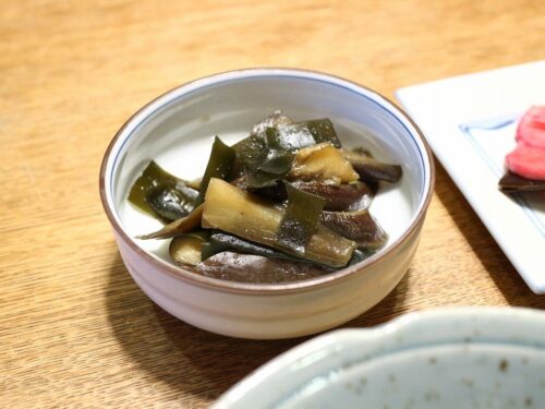 ナスと昆布を昆布水で煮てだし醤油で味付けしただけ