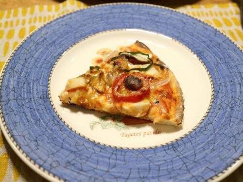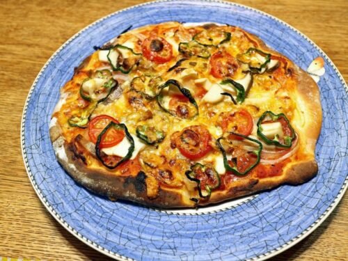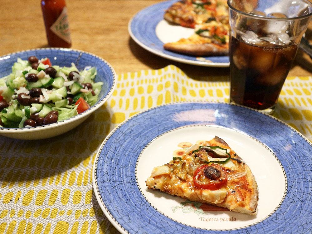 ■ピザ(自家製ベーコン・玉ねぎ・ピーマン・エリンギ・ミニトマト・シュレッドチーズ・トマトソース)