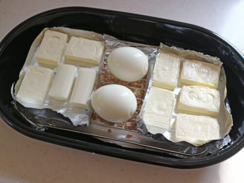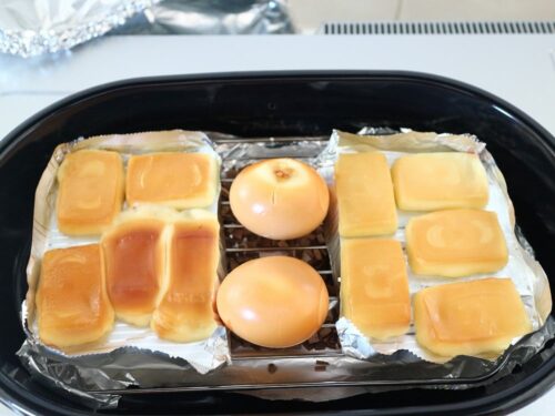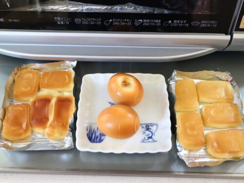 パナのサイトでは、容器の高さ以上のものは入れてはいけない、卵は「うずらの卵」推奨でしたが、置き場所変えたら(あるいは焦げてもよければ)、鶏卵でもいけそうです。