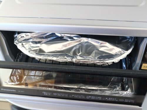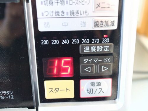 これには、現行のような「燻製」のスイッチボタンはついてませんが、手動で温度+タイムでできると踏んで、280℃で17分で設定。そのまま庫内で10分置きました。