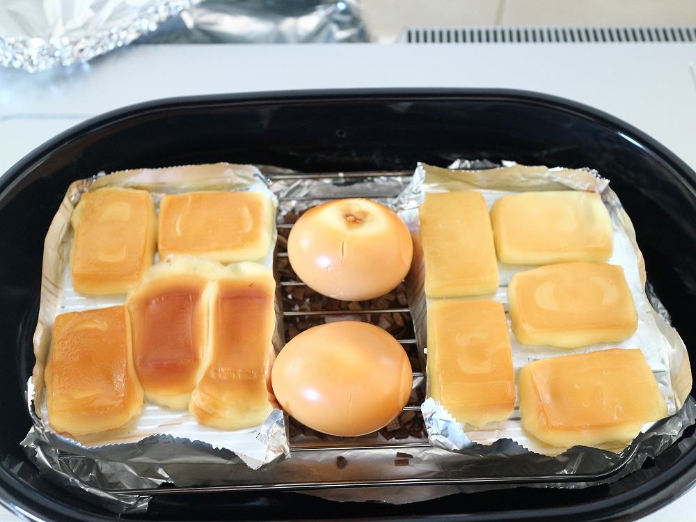 汚れ防止のアルミフォイルを敷いた上にチップを広げ(10gくらい)、網を置き、茹で卵と箱型にしたくっつかないアルミフォイルの中にプロセスチーズと裂けるチーズ
