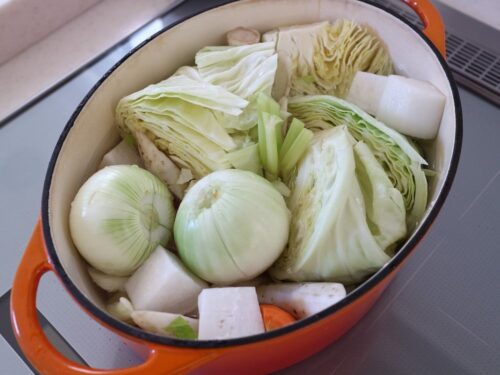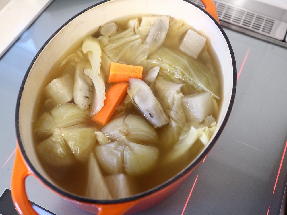もう一品はポトフ。手持ちで使えそうな、キャベツ、人参、大根、ゴボウ、セロリに