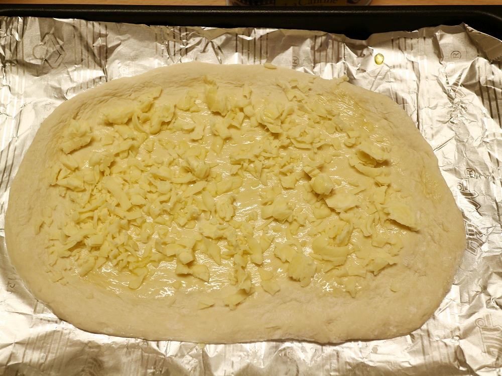伸ばしたクラストにオリーブオイルを塗って、シュレッドチーズをパラパラ
