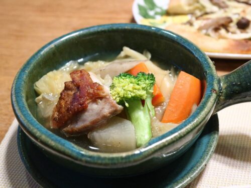 ポトフを盛ってカットしたチキンと茹でたブロッコリを添えてできあがり