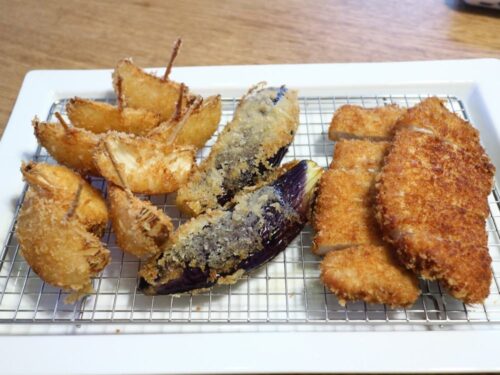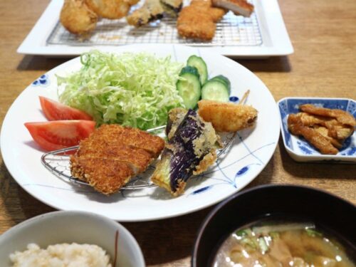 ■フライ(豚ロース・なす・玉ねぎ)■味噌汁(大混・油揚げ・大根葉)