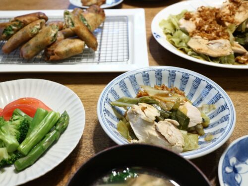 4/8-中華風献立 投稿日時: 2025-04-08 投稿者: はるみん ■春巻き■茹で鶏・香味ソース■サラダ(アスパラ・トマト・ブロッコリ)■スープ ■春巻き(豚肉・筍・椎茸・ニラ・葱・生姜) ■茹で鶏・香味ソース(茹でキャベツ)葱・生姜・醤油・砂糖・豆板醤・ごま油 ■スープ(三ツ葉・エノキ・卵) ■2025/04/08(火)雨→曇+6.6→+9.3