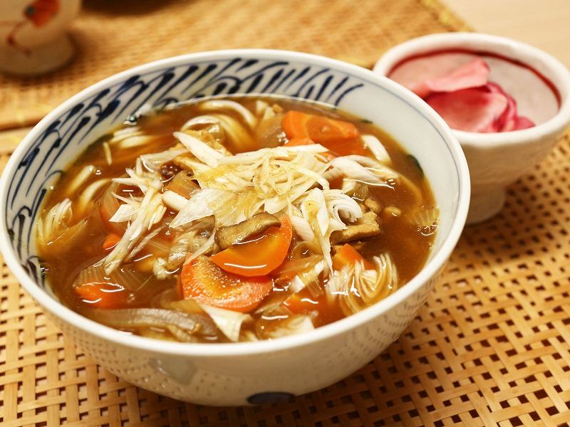 というわけでご飯は簡単に、カレーうどん(豚肉・椎茸・人参・葱)