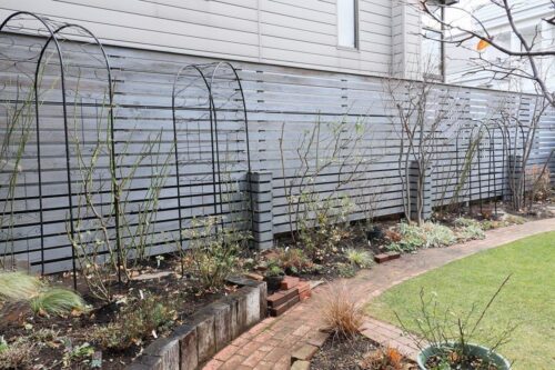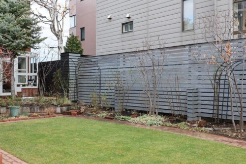 右の内側に、クレマチス「風の方位」を移植。