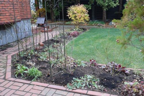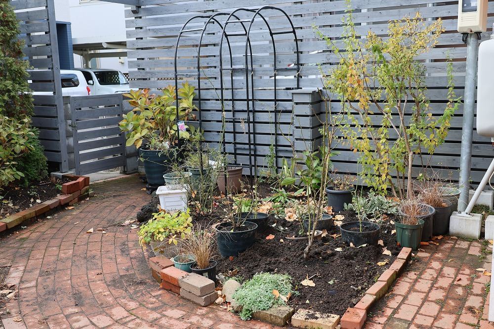 手前の右側にダイアナ、あと球根や宿根草を下ろして、冬越し鉢埋め