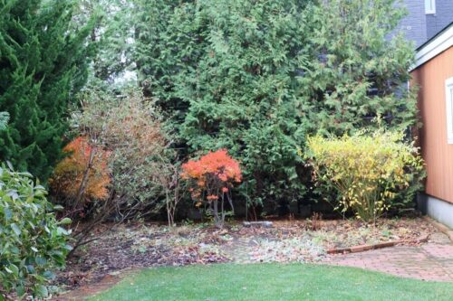 右手前のニオイヒバの間に見える黄色っぽい葉っぱの低灌木は、↑のと同じく、5月に小屋裏から移植したドウダンツツジですが、ここは日当たりが悪いので、紅葉してません。