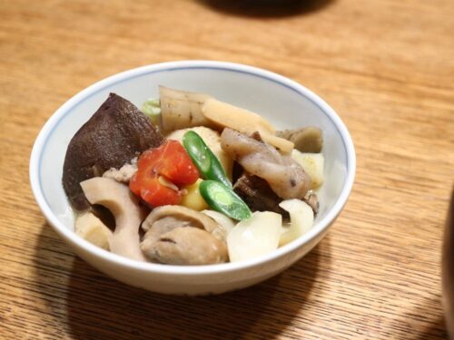 お皿と筑前煮の器は、デパートのWEBサイトで買った青花の福袋の品。