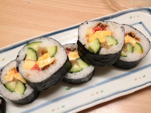 一昨日の酢飯が残っていたので、あるものを巻いた巻きずしと