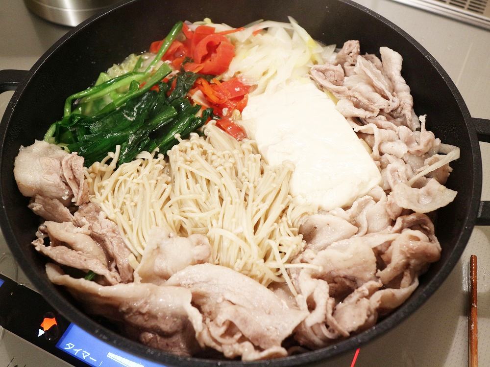 豚ばら肉・白菜・葱・エノキ・人参(筑前煮の人参の抜き)ニラ・絹ごし豆腐