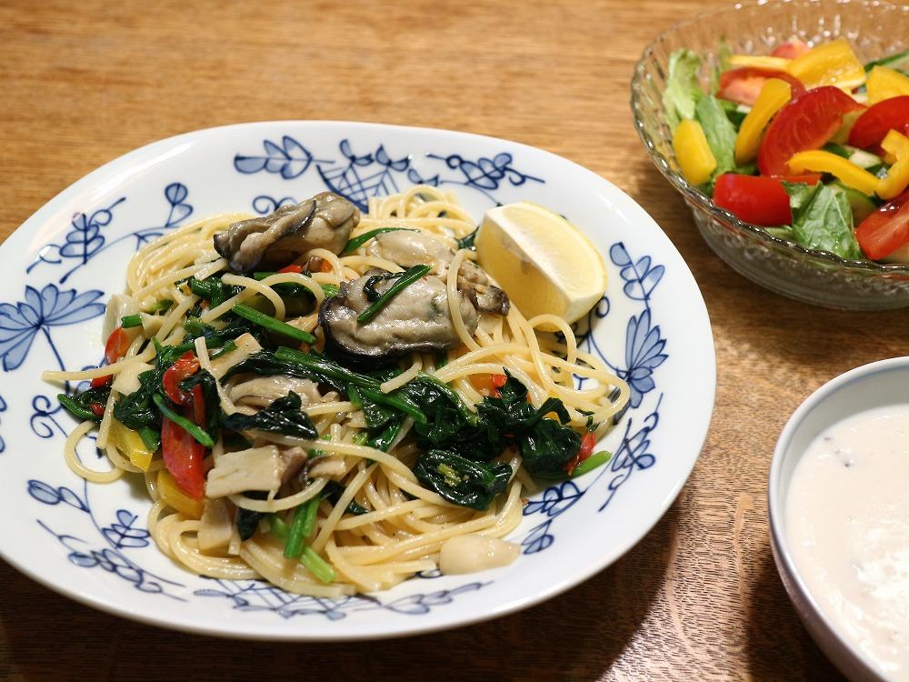 1/7-牡蠣のパスタ 投稿日時: 2026-01-07 投稿者: はるみん年末に作った牡蠣のオイル漬けを使って ■牡蠣のパスタ(オイル漬けの牡蠣・ほうれん草・エリンギ・ニンニク) ■サラダ(レタス・カラーピーマン・きゅうり)■2026/01/07(水)晴れ→雪-9.4→+1.1