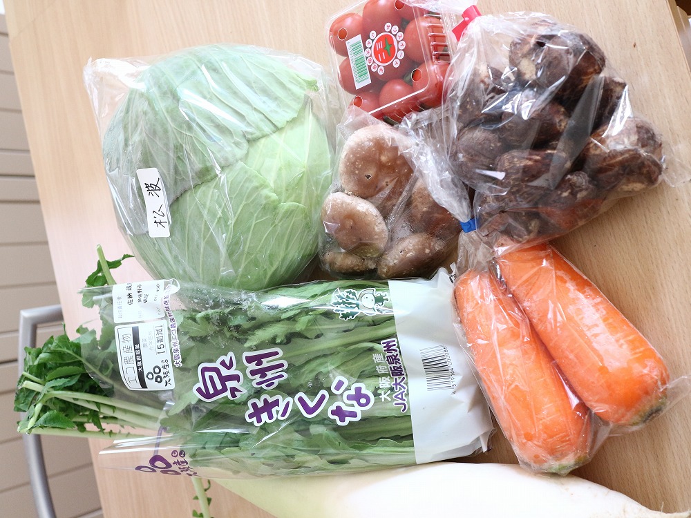 松波キャベツ、泉州きくな、大根、人参、椎茸、里芋、ミニトマトの7品