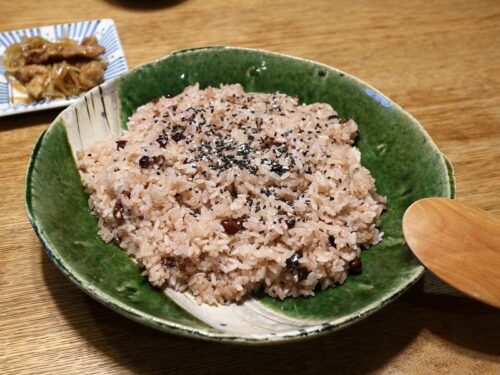 お赤飯は、茹で汁と一緒に冷凍ストックしている小豆使用、もち米とうるち米を2:3の割で