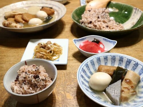 なんの日でもありませんが、セールで買ったレトルトのおでんが届いたので、お赤飯にしました。